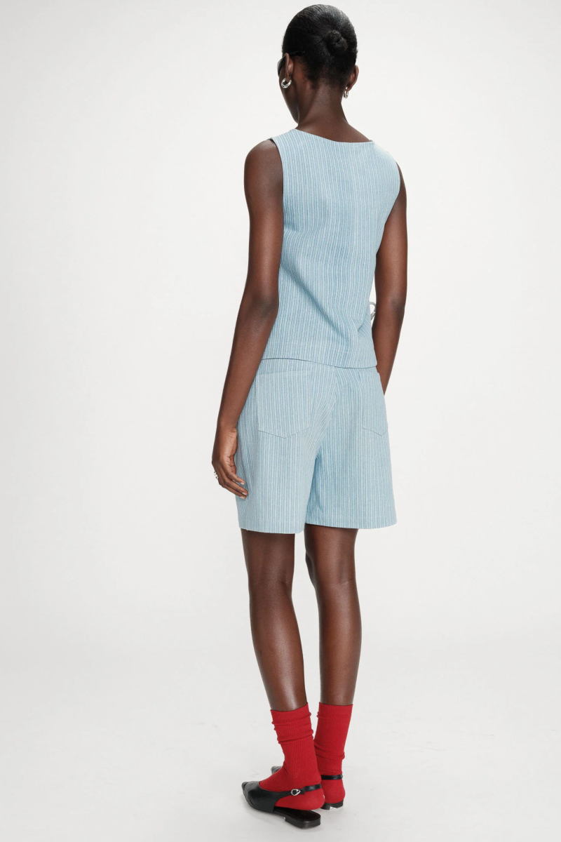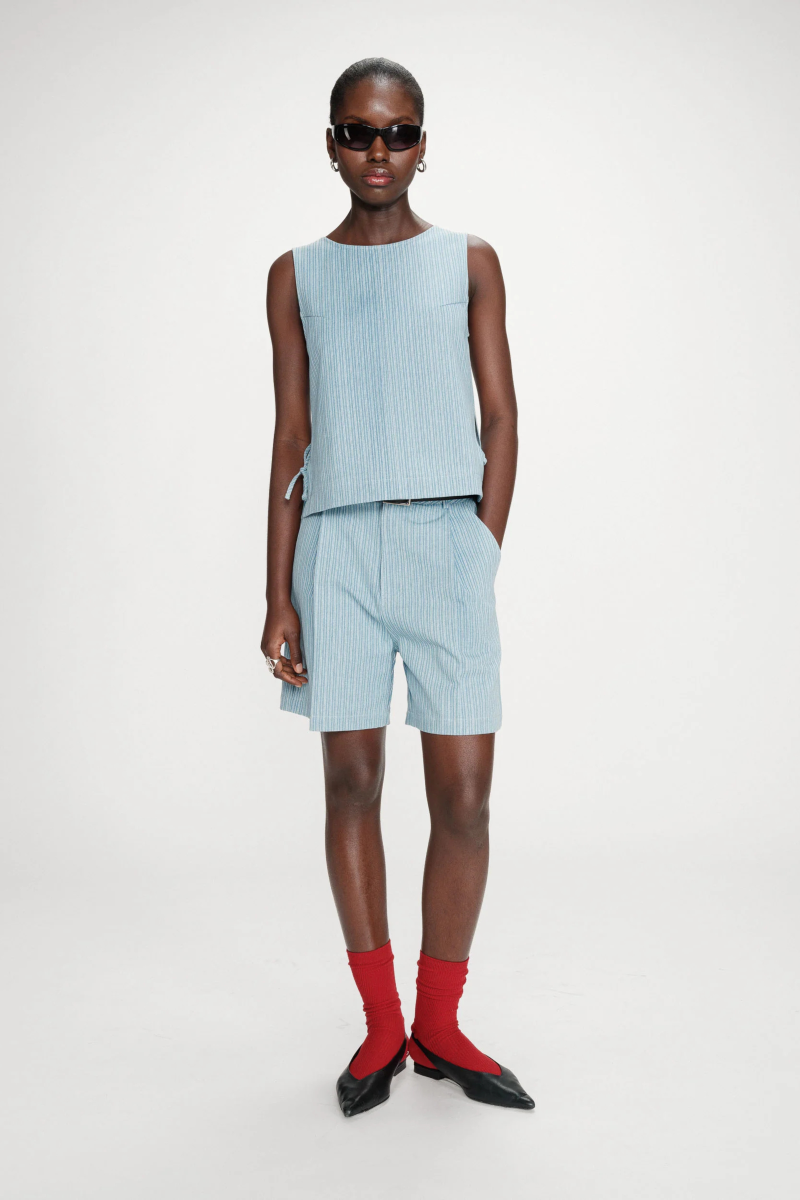 De VENDOME top met fijne strepen heeft een ronde halslijn en is mouwloos. De strikbare zijsplitten geven dit casual basisstuk een vleugje luchtigheid. De VENDOME top van 100% katoenen denim heeft een rechte pasvorm. Leuk te combineren met bijhorende short of witte broek.