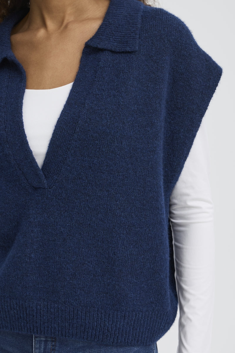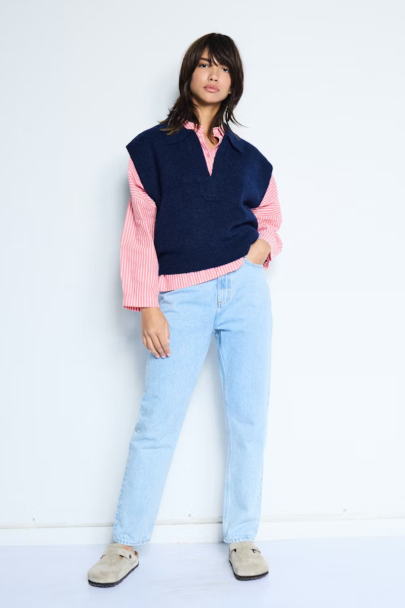 Deze debardeur heeft een relaxte pasvorm, verlaagde schouders, open V-hals en puntkraag. De geribde zoom zorgt voor een subtiel detail en een moderne, nonchalante stijl. Leuk te combineren met longsleeve of blouse.