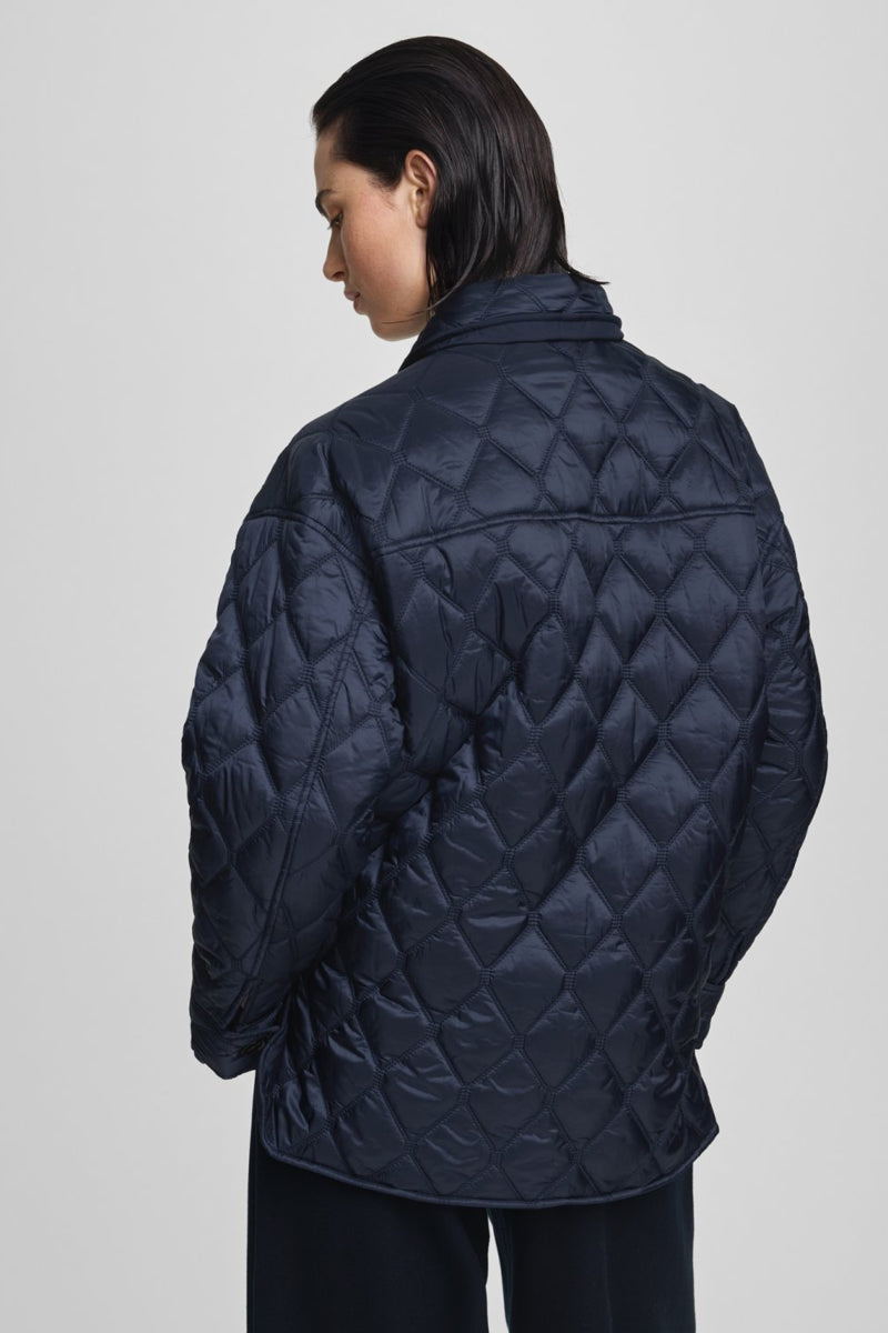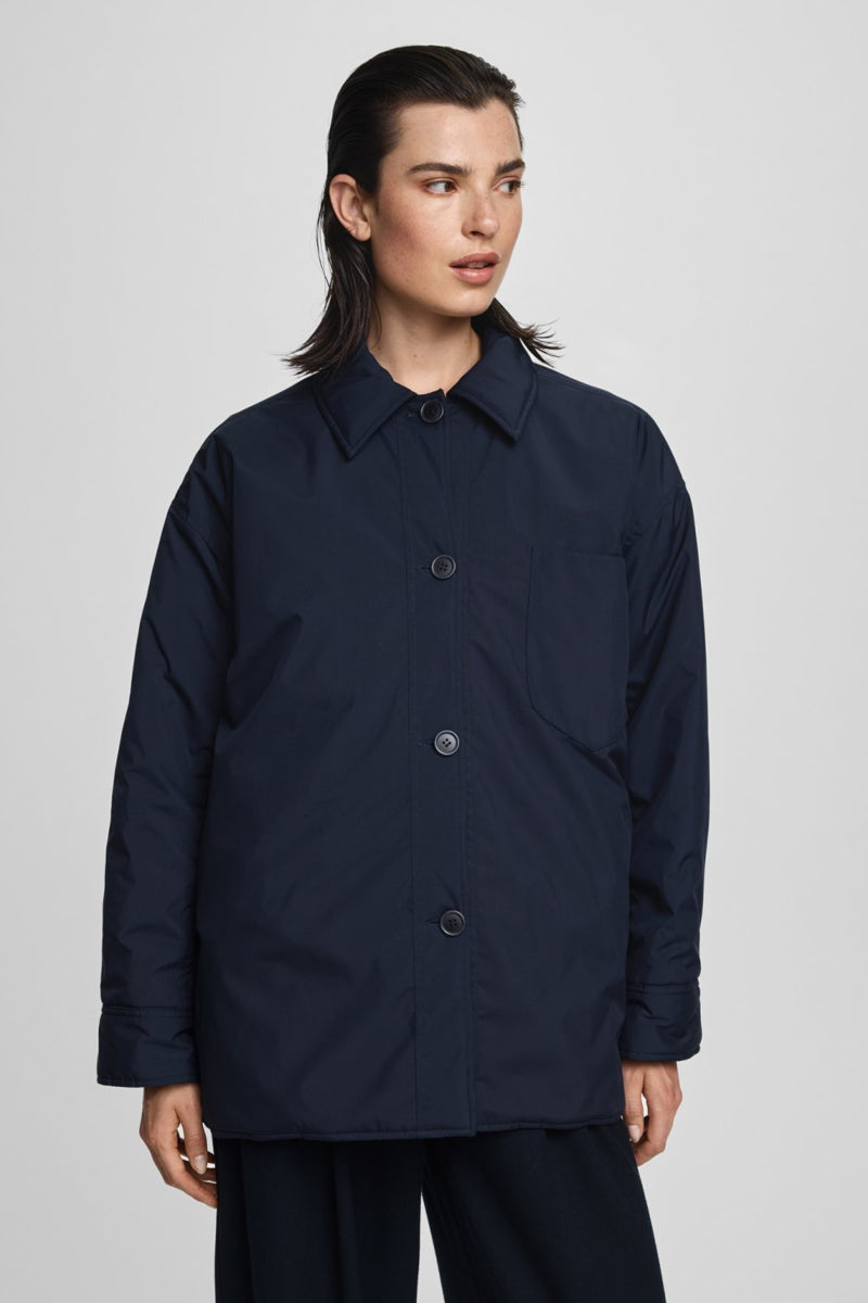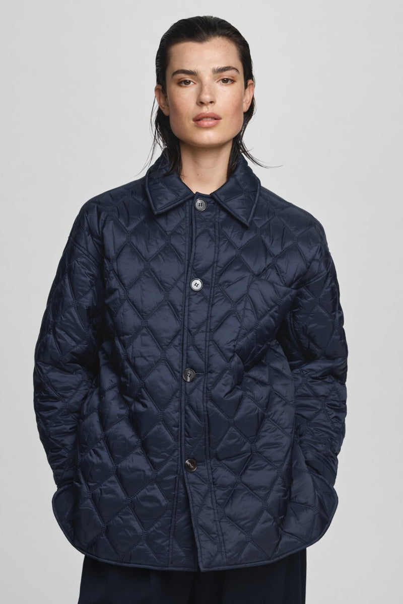 De Melli jas k is een moderne jas voor dagelijks gebruik. De ene kant heeft een effen oppervlak, terwijl de andere kant gewatteerd is. Het jack is omkeerbaar, zodat je het voor verschillende gelegenheden kunt stylen. De kleur is een diepe blauwe tint, die tijdloos en klassiek is. Het jack heeft een kraag, borstzak en knoopsluiting.