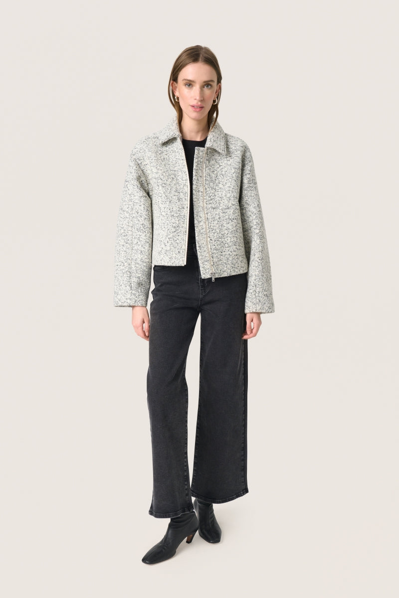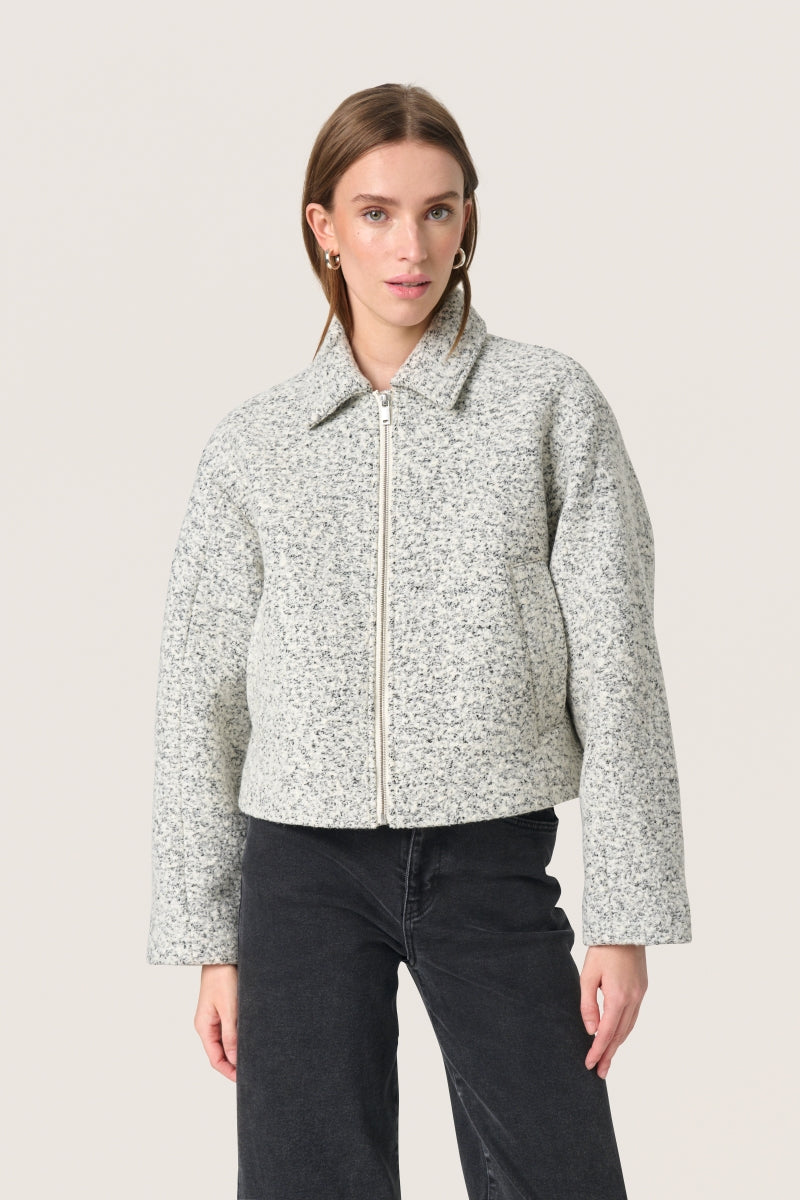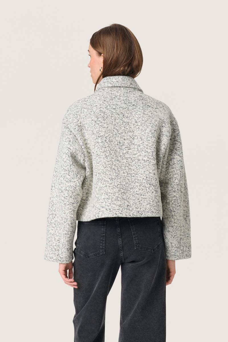 Kort jasje in het lichtgrijs met ritssluiting en klassieke kraag. De boxy pasvorm en het gestructureerde oppervlak zorgen voor een moderne look, terwijl de stof met 40% wol zowel warmte als zacht comfort biedt. T