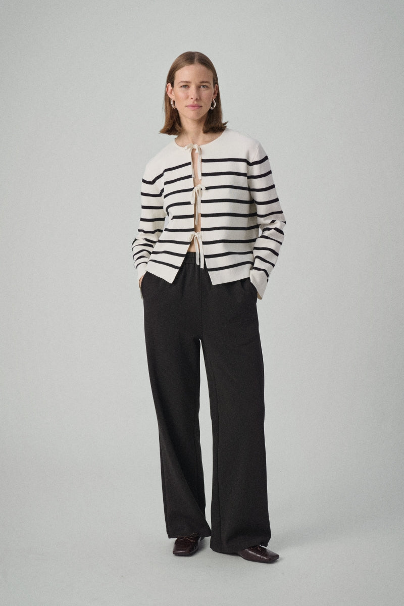 Gestreepte cardigan van zachte kwaliteit met strikbandjes aan de voorkant. De combinatie van zwart en wit zorgt voor een klassieke en toch moderne uitstraling. Ideaal om te combineren met andere kledingstukken of als lichte buitenlaag.